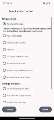 Rename multiple files at once using customizable formats, including timestamps and metadata.