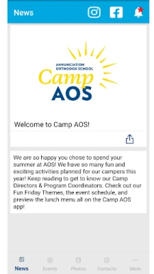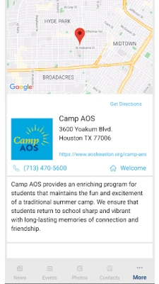 Features include: • Targeted push notifications and emails for your child's specific camp • Facial recognition to immediately receive photos of your child • A news feed with photos to see everything that's happening at Camp AOS This app is for Camp AOS families. Camp AOS provides an enriching program for students that maintains the fun and excitement of a traditional summer camp. Campers return to school sharp and vibrant with long-lasting memories of connection and friendship. For more information about Camp AOS, visit www.aoshouston.org/camp-aos.