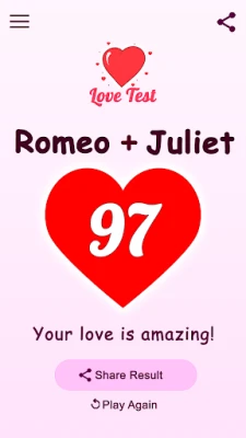Remember, this app is all about fun and entertainment. While it’s not a scientific love test, it’s a playful way to spark conversations about love, compatibility, and relationships. Enjoy the experience and take the results lightly!