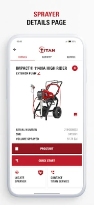 • Get real-time usage data from your connected Titan sprayer including: Material Usage, Operating Time, and Pressure Settings