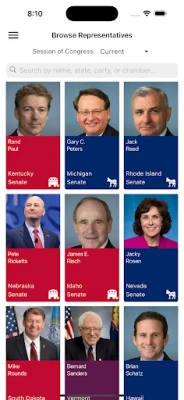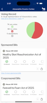 - View their state, party, district, voting records, and sponsored/cosponsored bills.